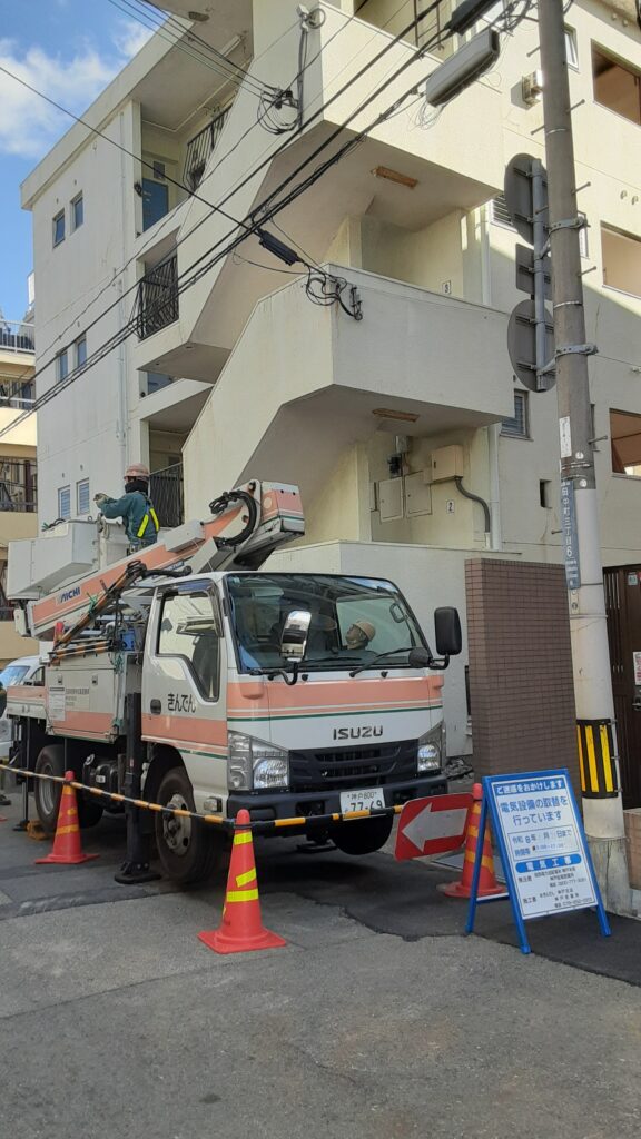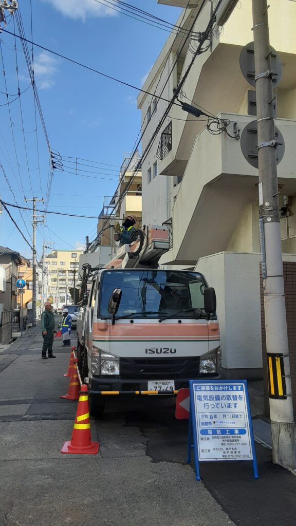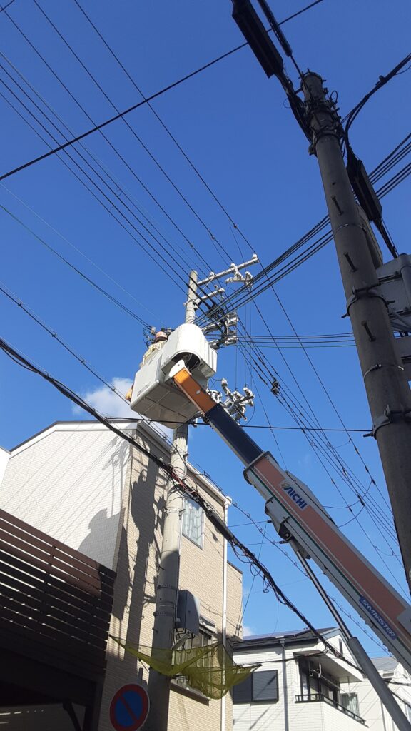 本日は、電気の引き込み線と、メーターの撤去にきんでん様に来ていただいています。